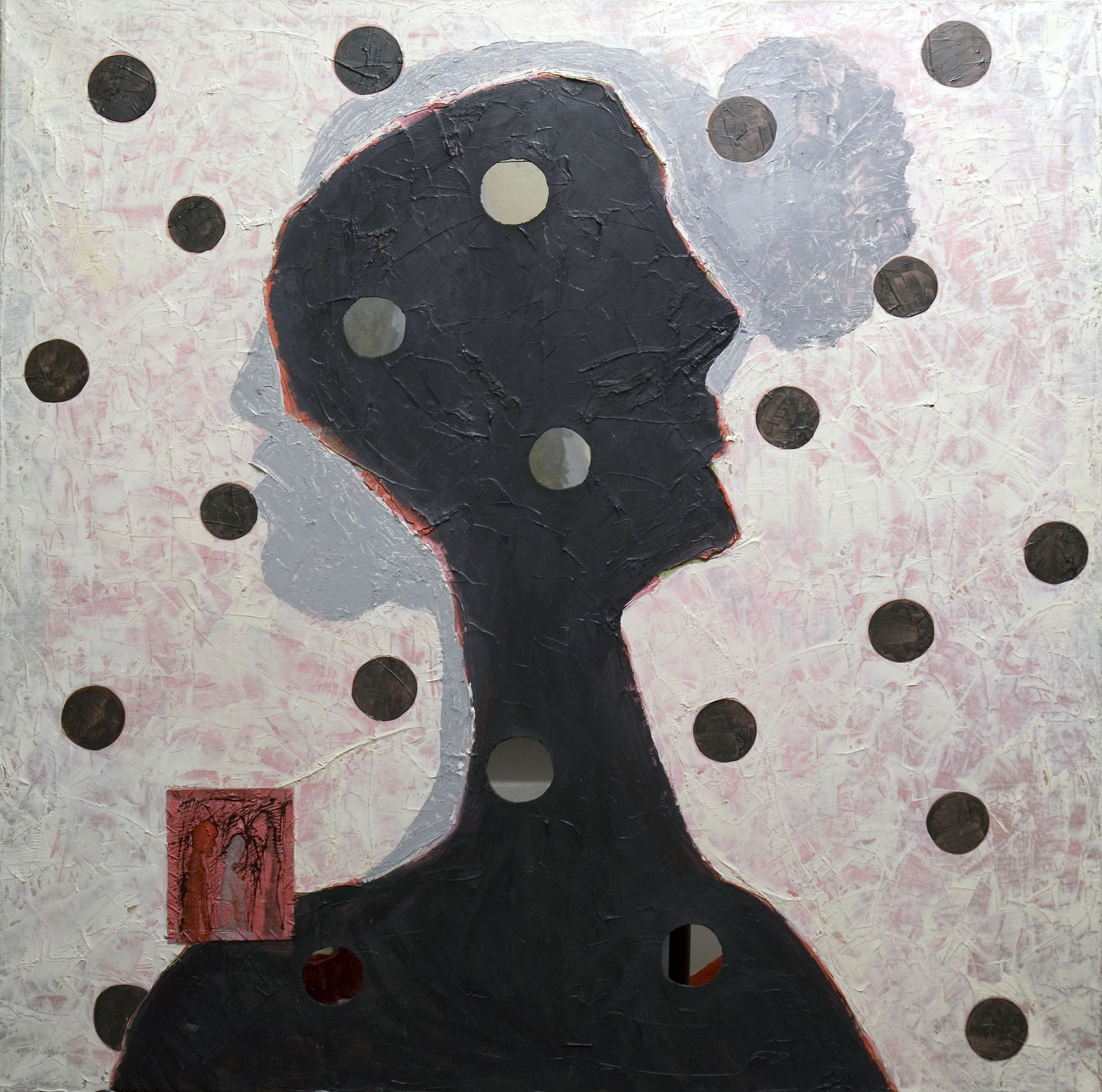 Painting with a profile and figures painted in white, red and black and blue. Made with large strokes of oil paint and pigments on linen. This is a strong work with thick vibrant layers of paint. The heads are surrounded by raffia embroidery’s. This painting is part of a four tych painting.